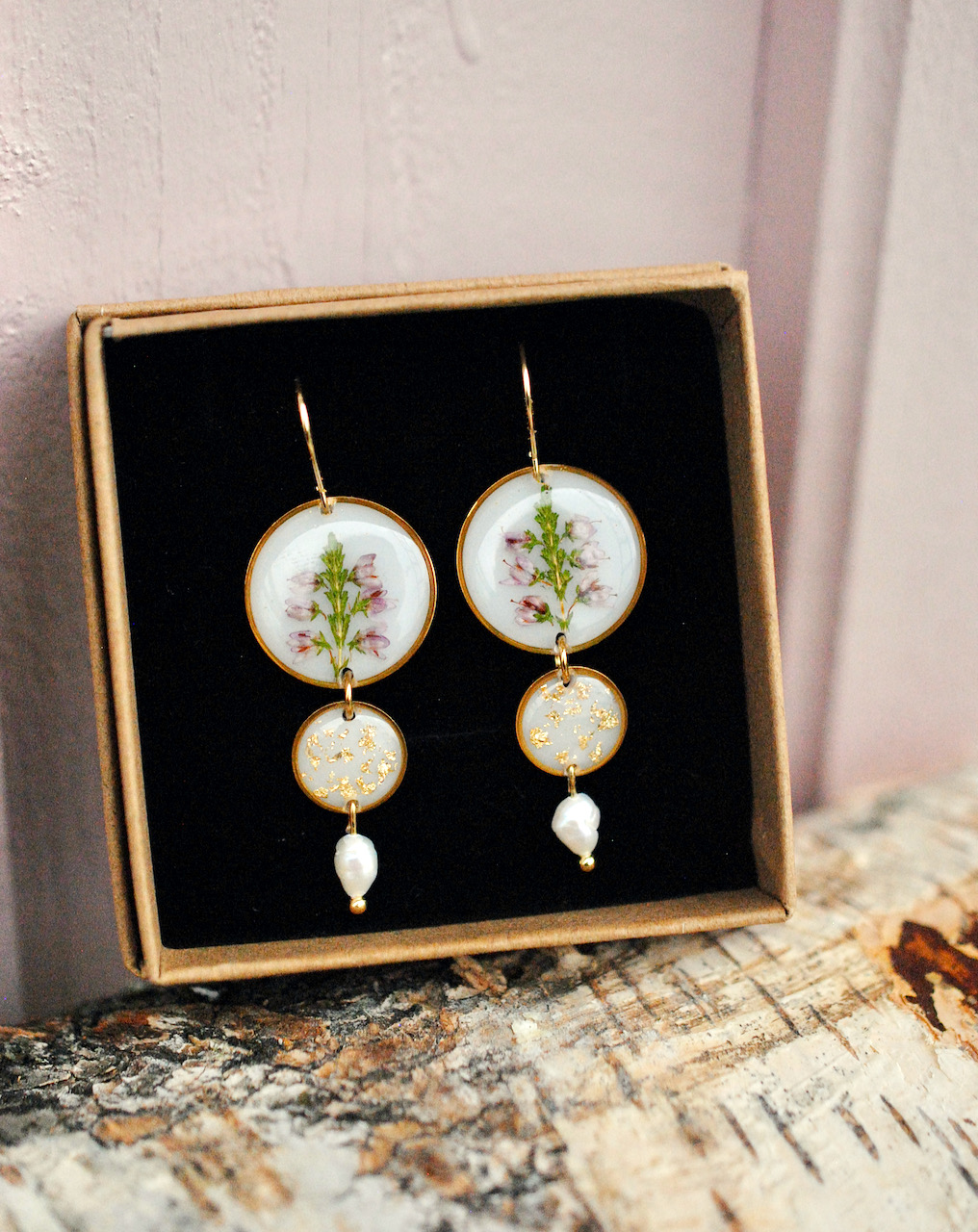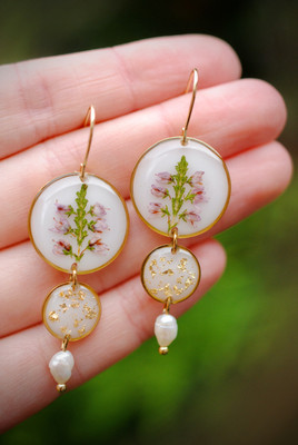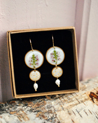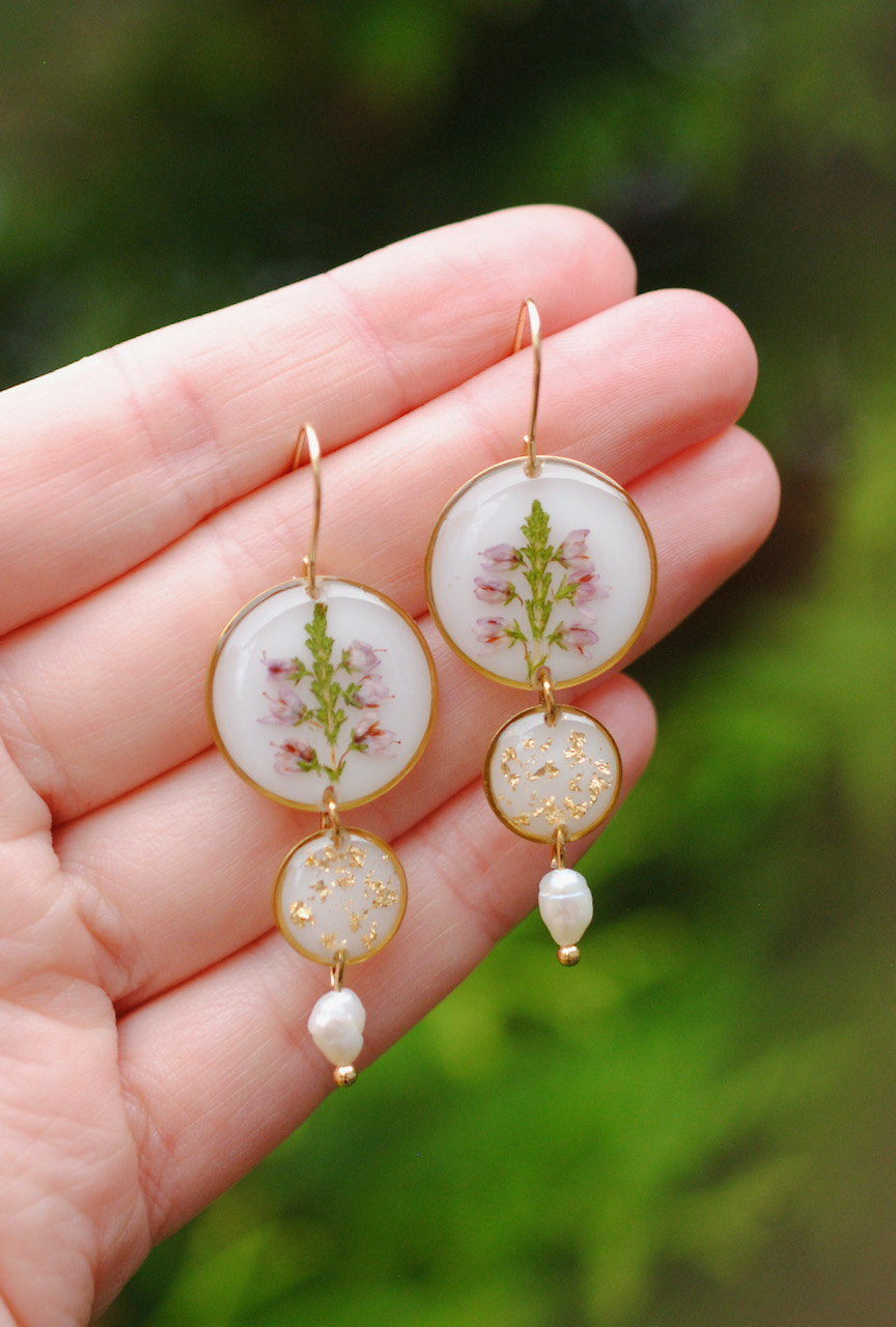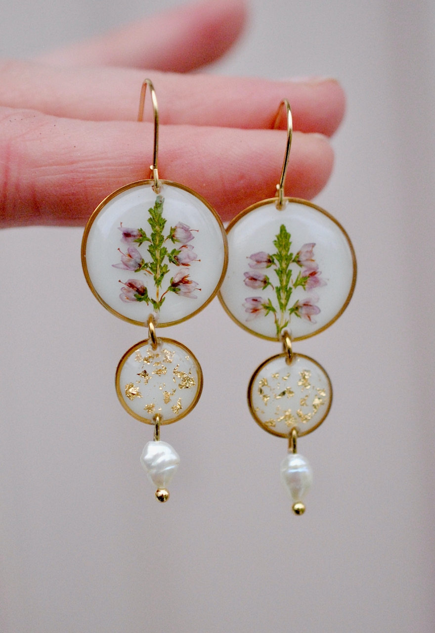 Näyttävät mutta herkät korvakorut aidoilla kanervan kukilla ja makeanvedenhelmillä.