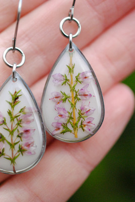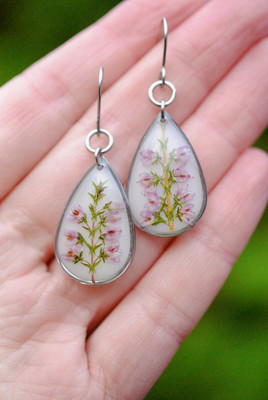 Herkät pisaran malliset korvakorut aidoilla kanervan kukilla.