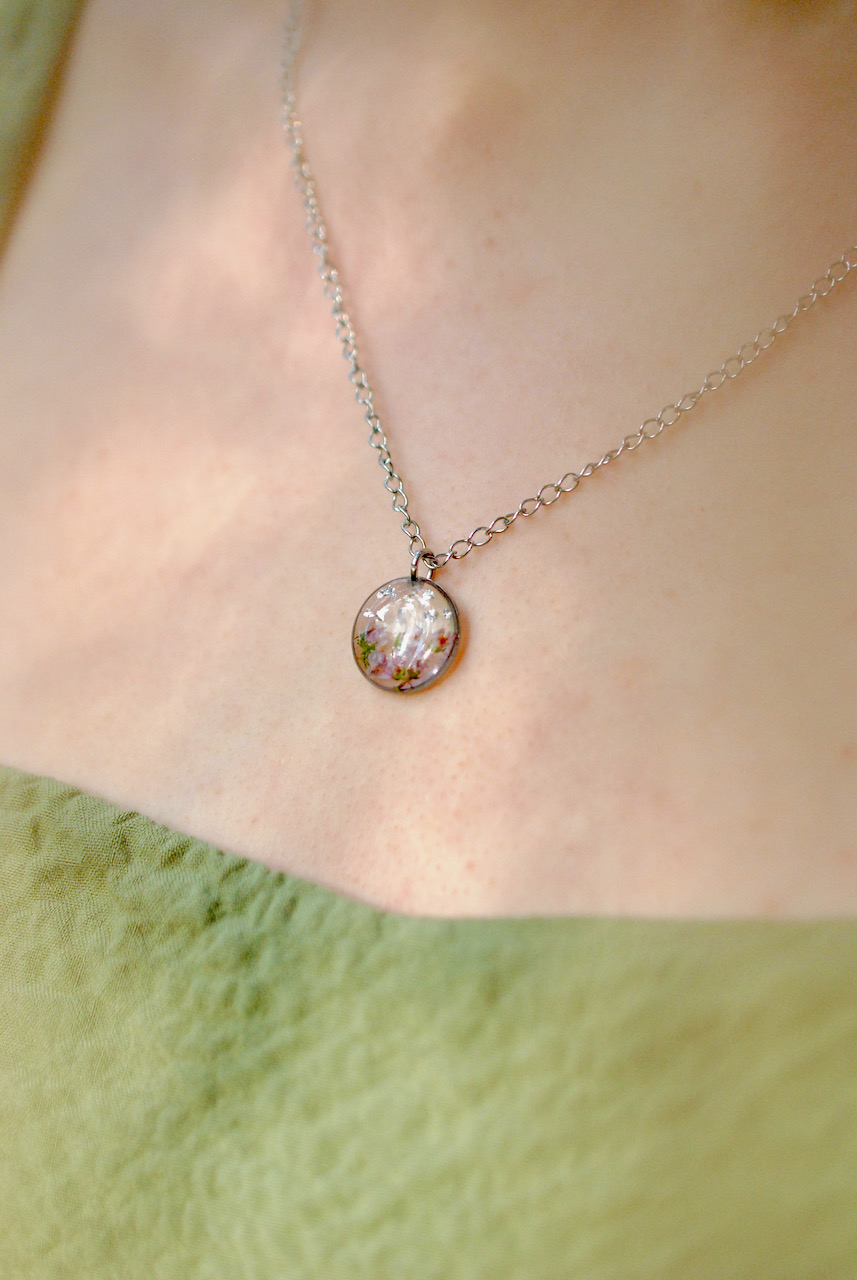 Herkkä kaulakoru aidolla kanervan kukalla.