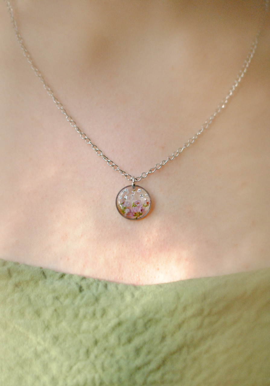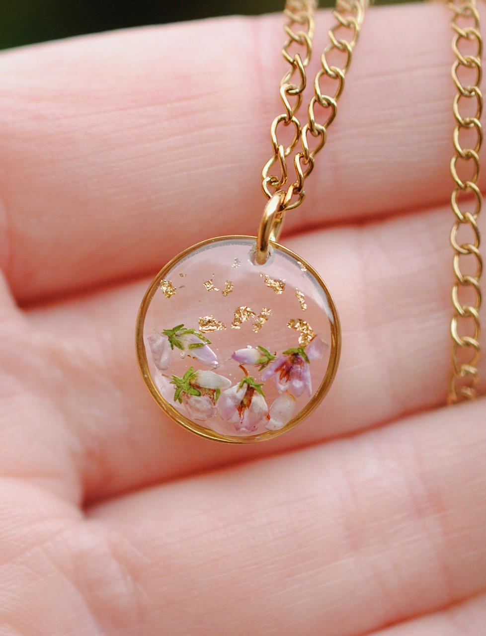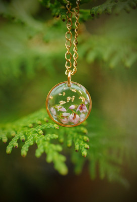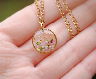 Herkkä kaulakoru aidolla kanervan kukalla.
