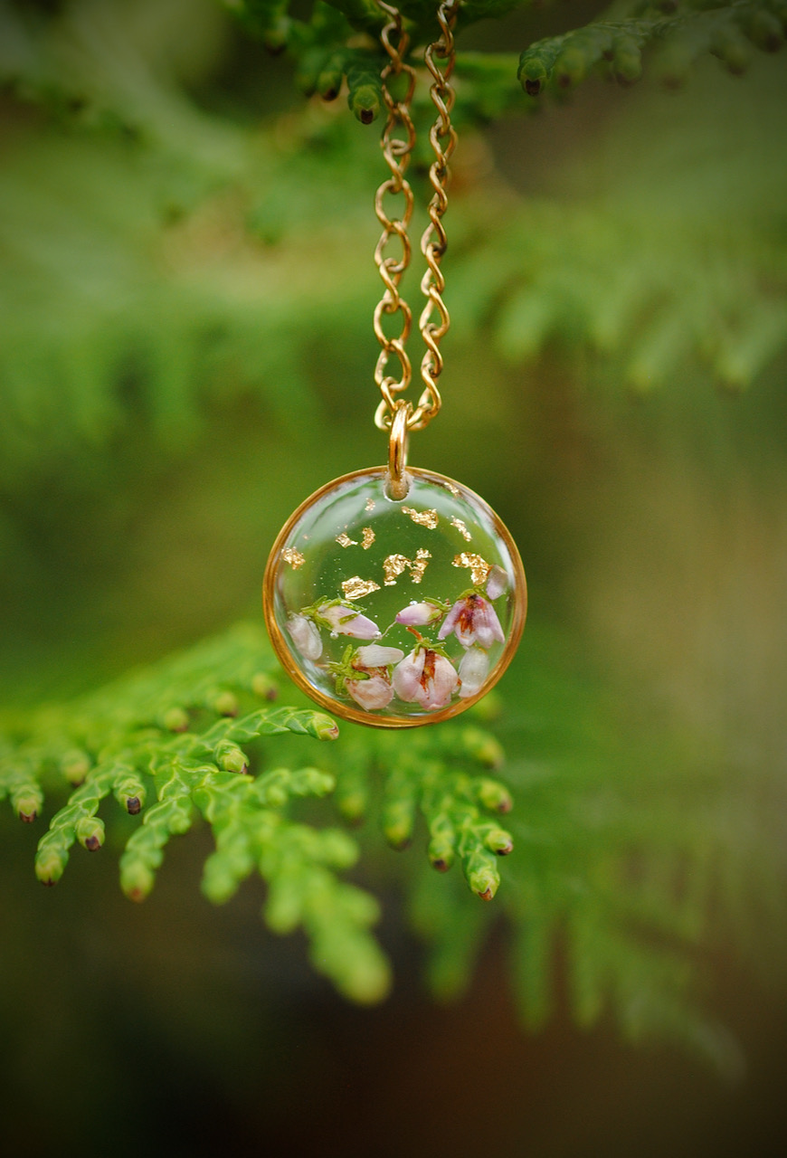 Käyttämäni kanerva on kangaskanervaa Pohjois-Savon metsistä. Kanervan lisäksi korussa on lehtikultaa.