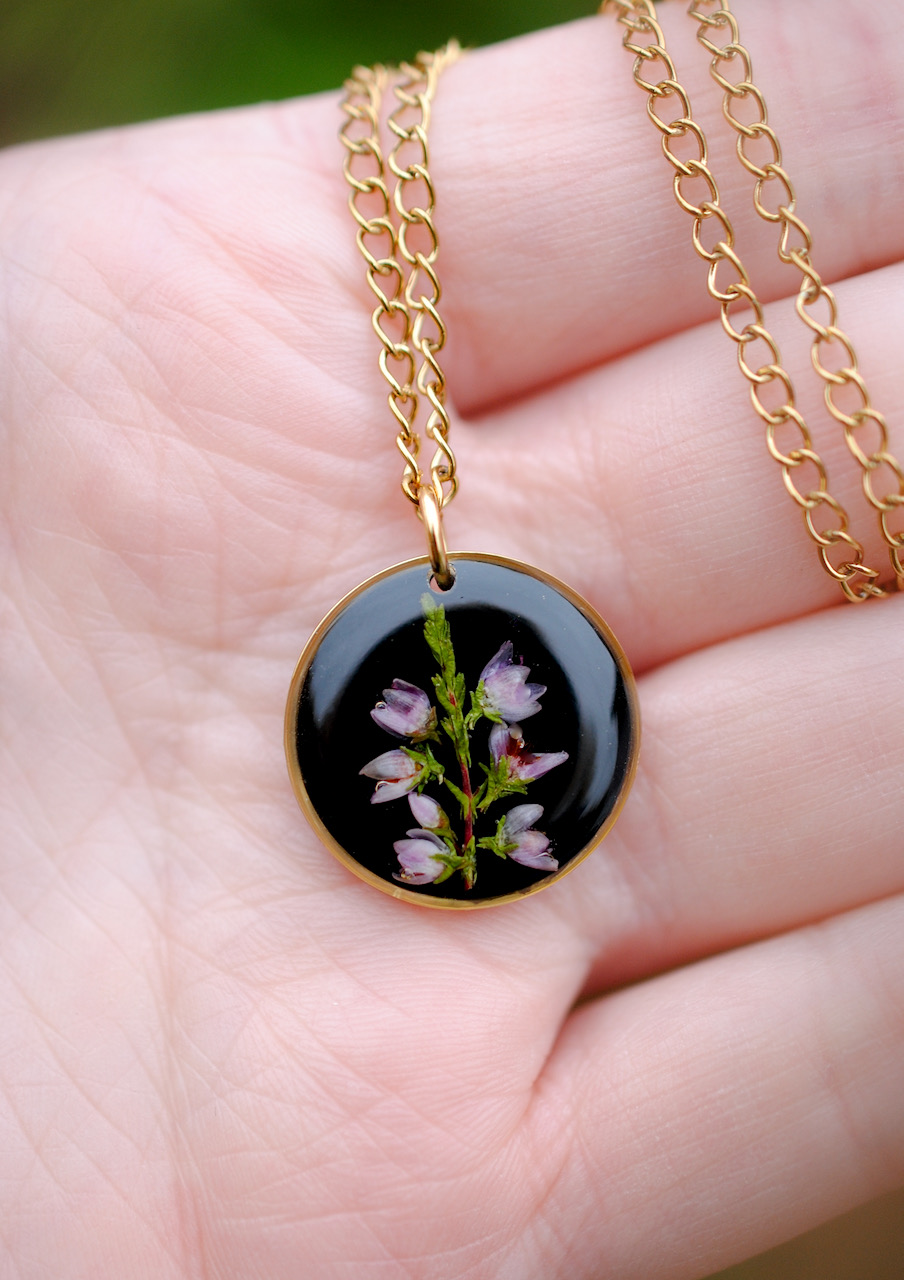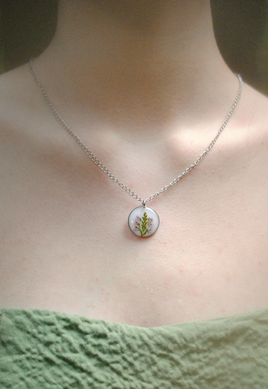 Herkkä kaulakoru aidolla kanervan kukalla.