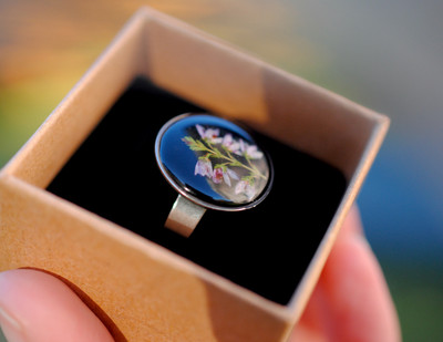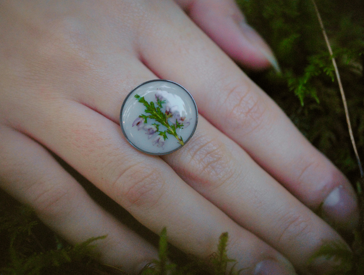 Kaunis sormus aidolla kanervan kukalla. Ruostumatonta terästä, säädettävä koko.