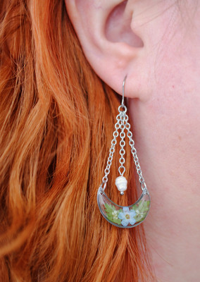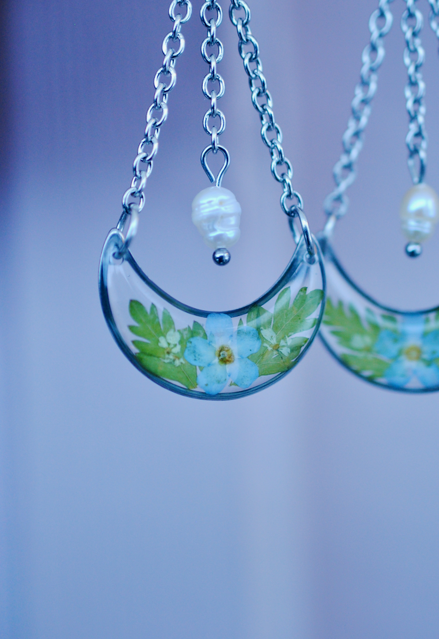 Kuukehto-korvakoru keinuu upeasti liikkeen mukana! Kuunsirpissä aitoja lemmikin ja koiranputken kukkia ja lehtiä. Lisänä kaunis makeanvedenhelmi.