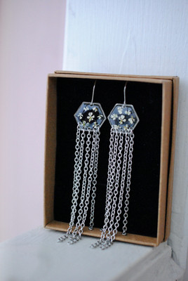 Korvakorun pituus ilman koukkua n. 9 cm. Koruosa (hexagon) on halkaisijaltaan vain n. 18 mm. Korut ovat todella kevyet ja sirot pituudestaan huolimatta.