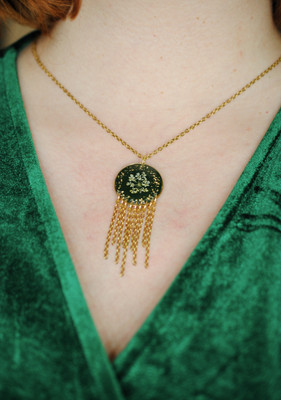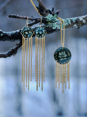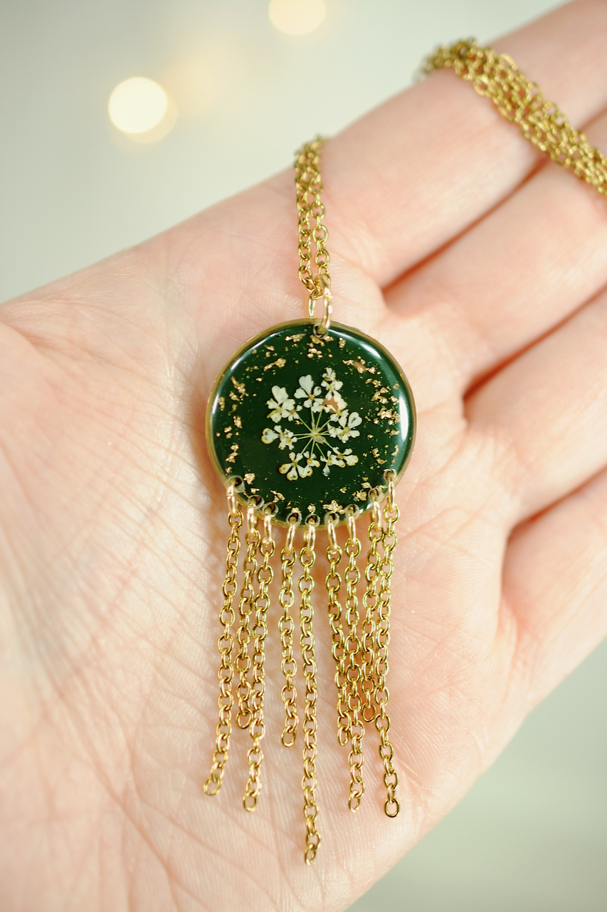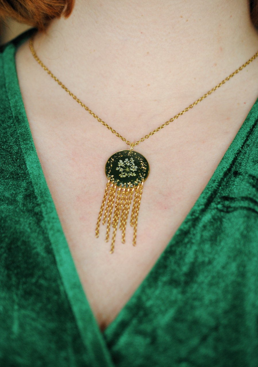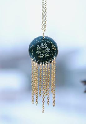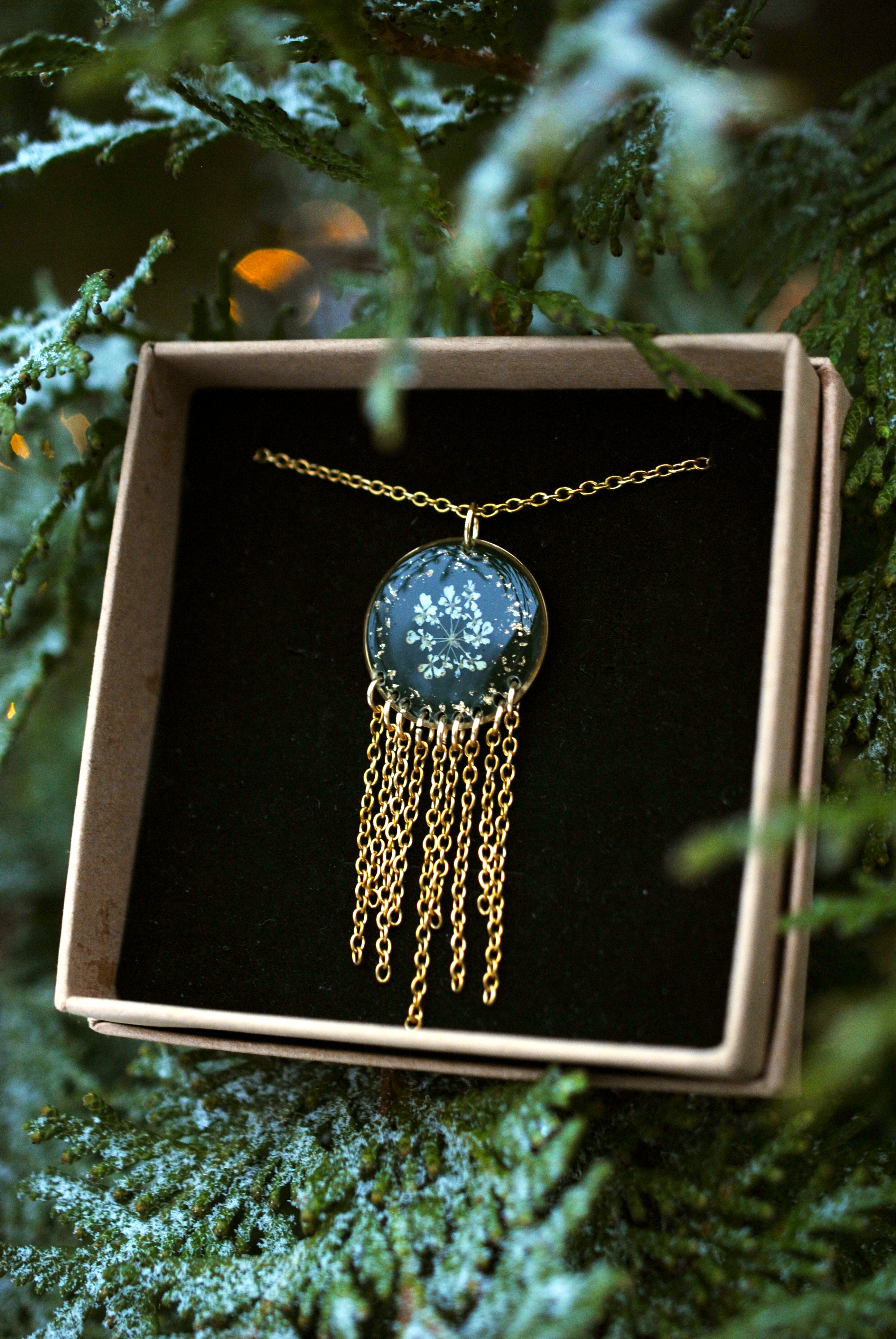 Talvipäivänseisauksen ja keskitalven taikaa hehkuva riipus. Koru on näyttävä, mutta kevyt kantaa. Sisältää aitoja koiranputken kukkia!