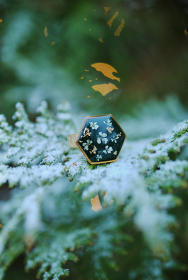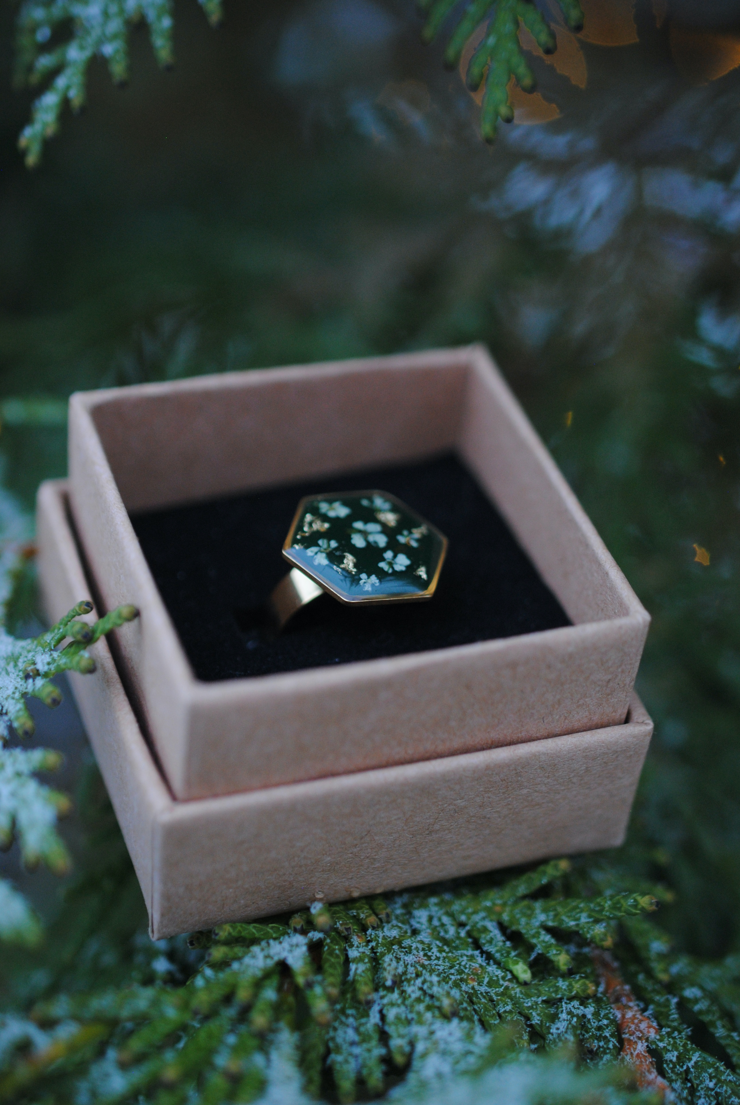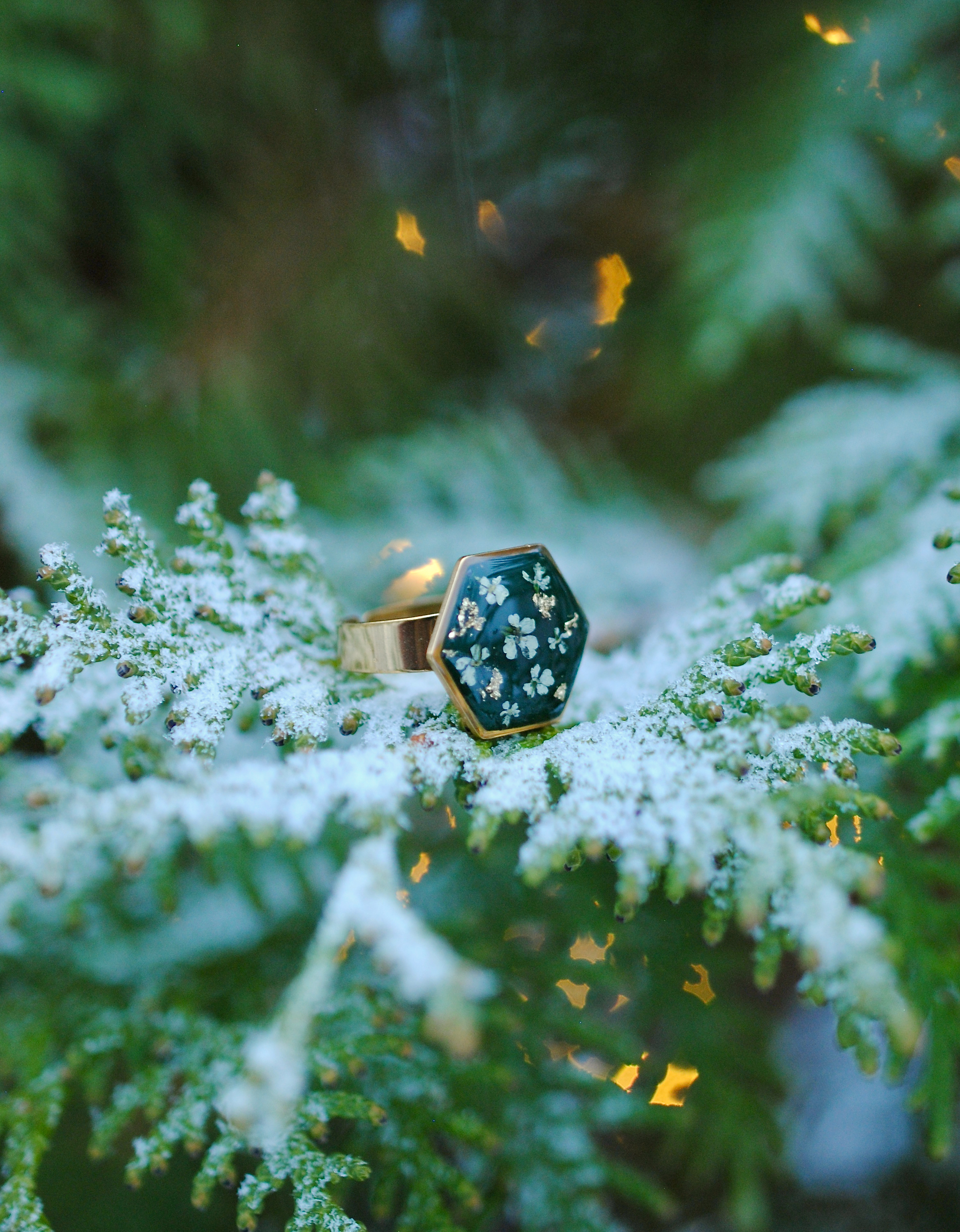 Talvipäivänseisauksen ja keskitalven taikaa hehkuva säädettävä sormus. Sisältää aitoja koiranputken kukkia!